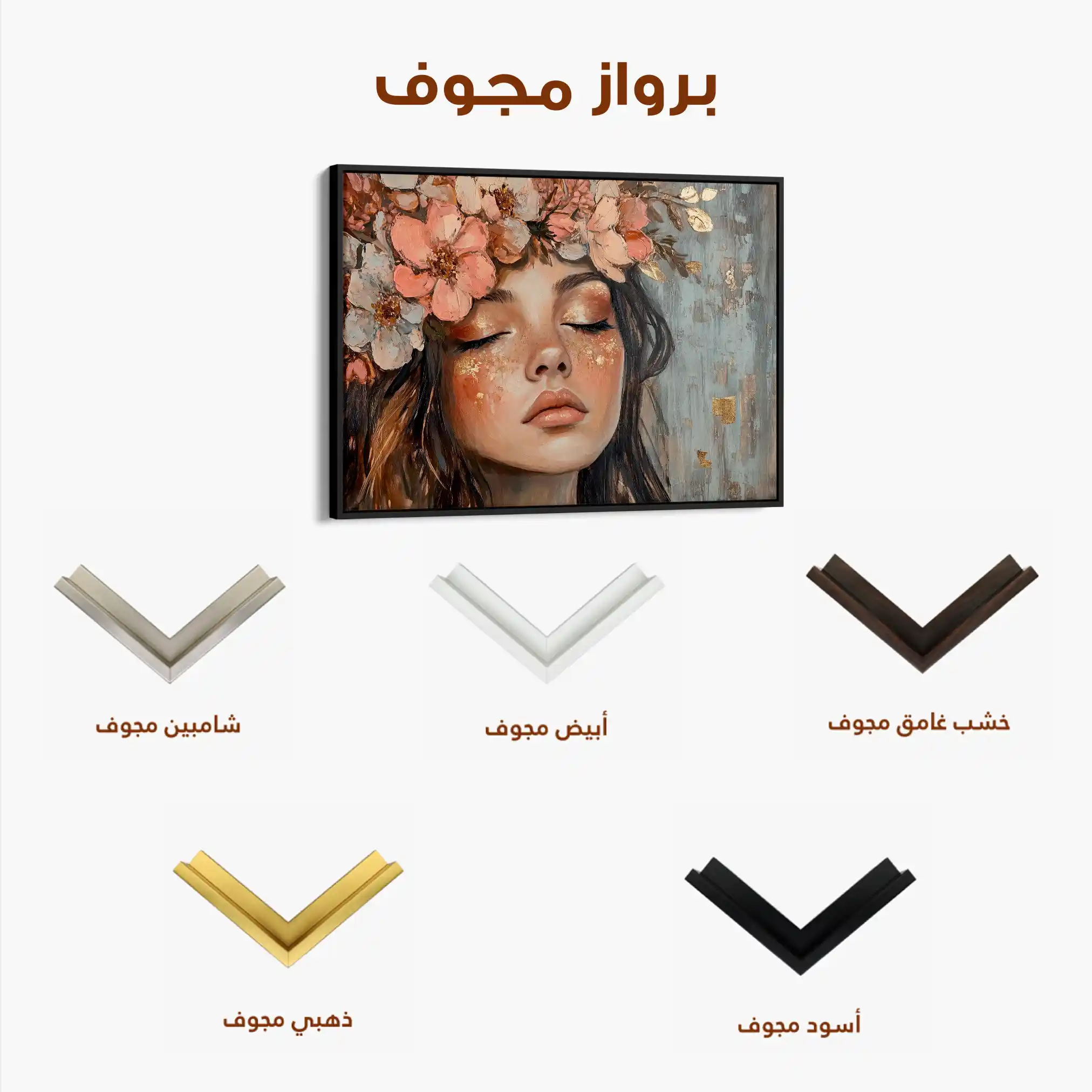 • الإطار (مجوف): إطار نحيف بفراغ رفيع يحيط باللوحة ليُبرز الحافة ويمنح ظلاً خفيفاً وإحساس صالات العرض؛ يصل جاهزاً للتعليق.