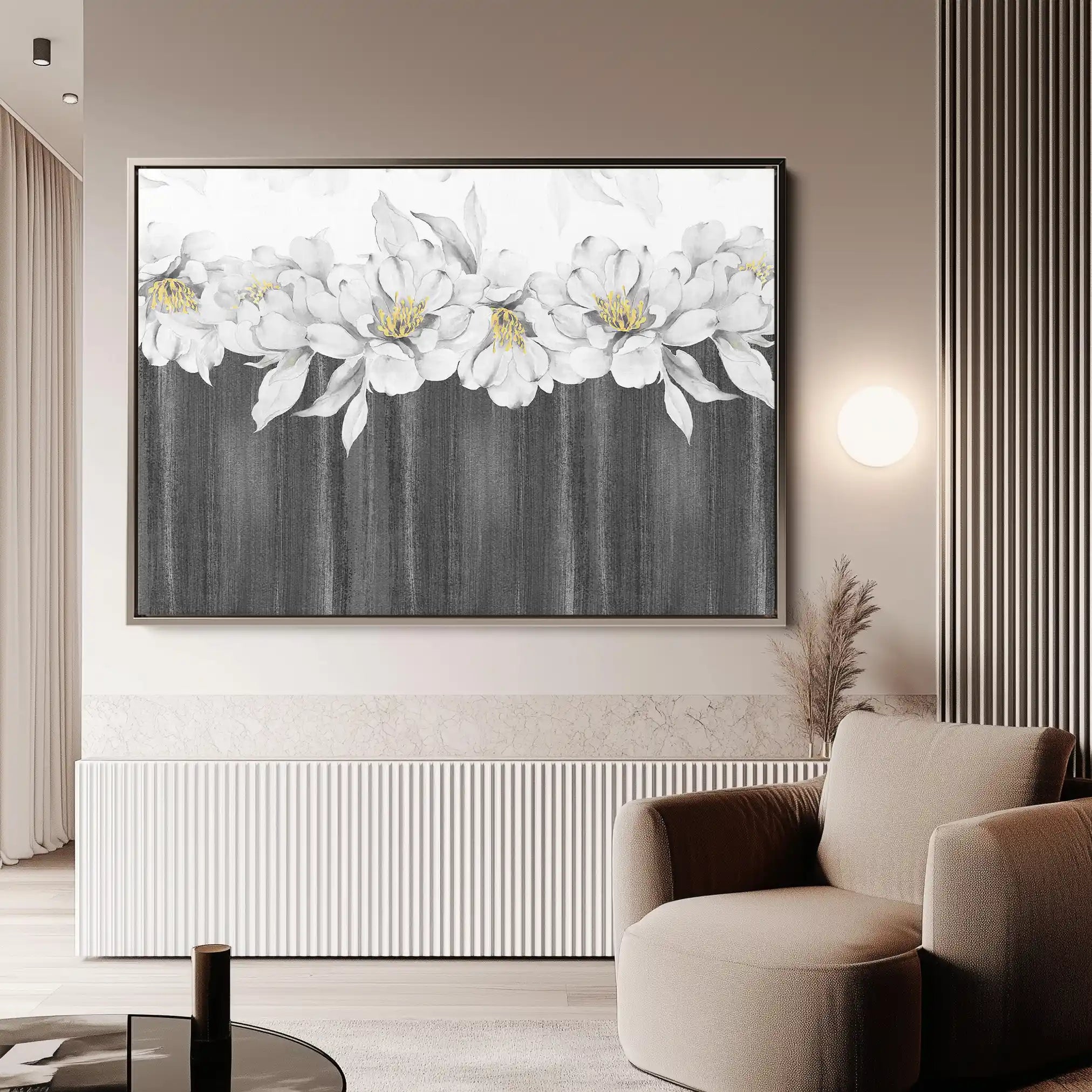 Modern wall art with quiet luxury. Museum-grade printing on 410gsm cotton canvas, set in a slim floater frame—clean, calm, ready to hang.